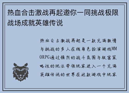 热血合击激战再起邀你一同挑战极限战场成就英雄传说